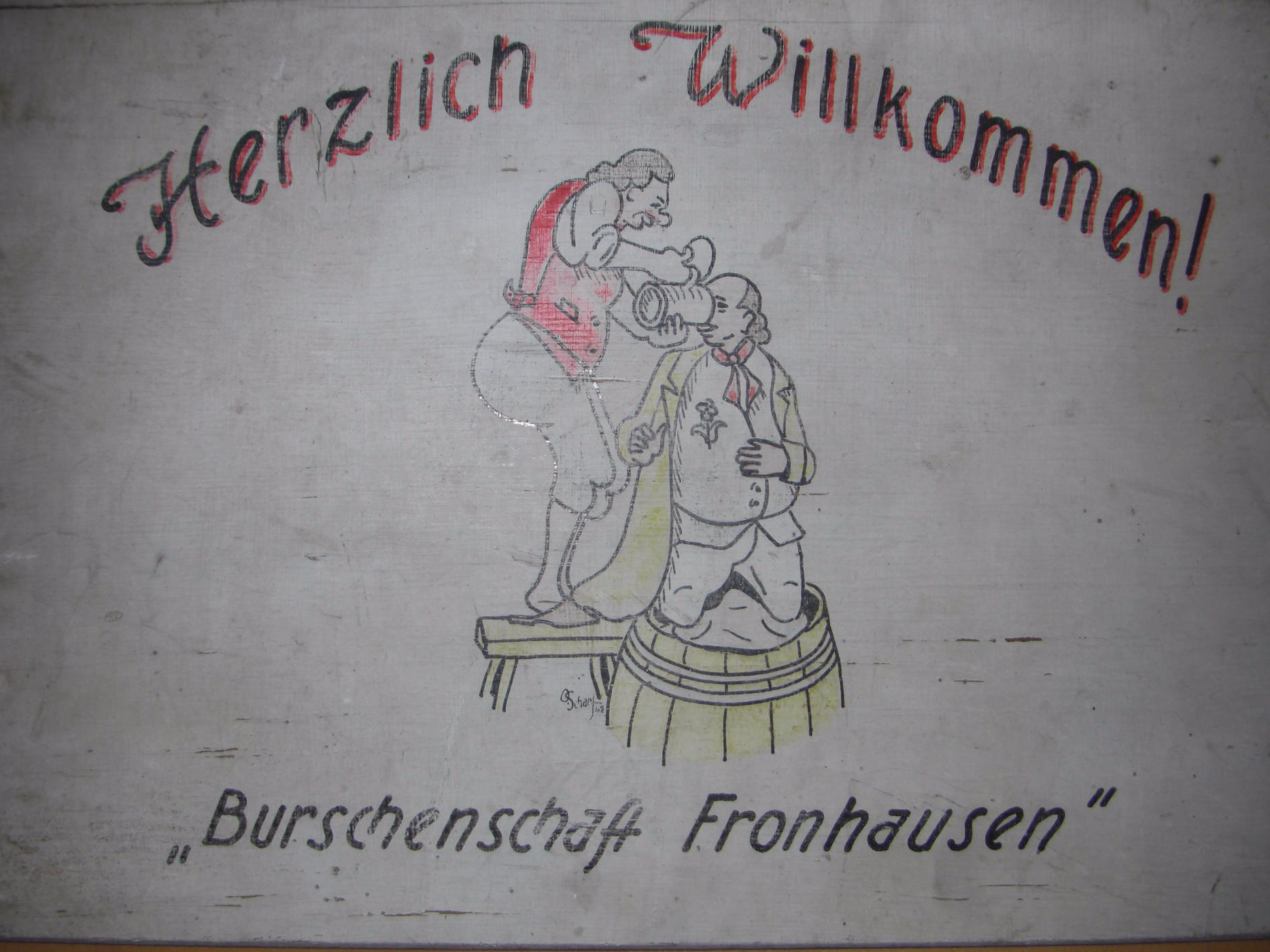 Unser verehrter Mitbürger und Maler Otto Scharff malte für eine Kirmes ein Begrüßungsschild, welches auch heute noch existiert.